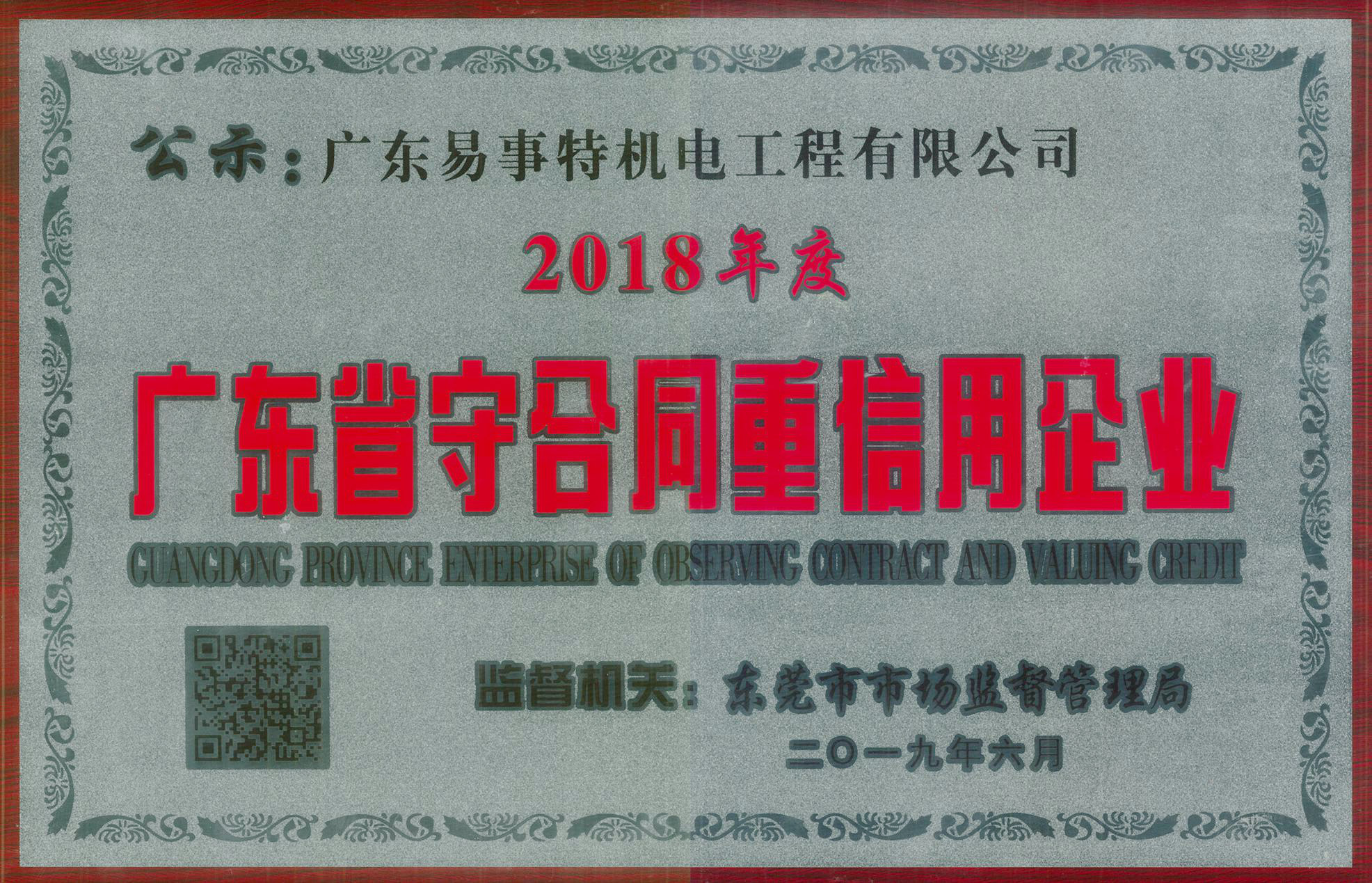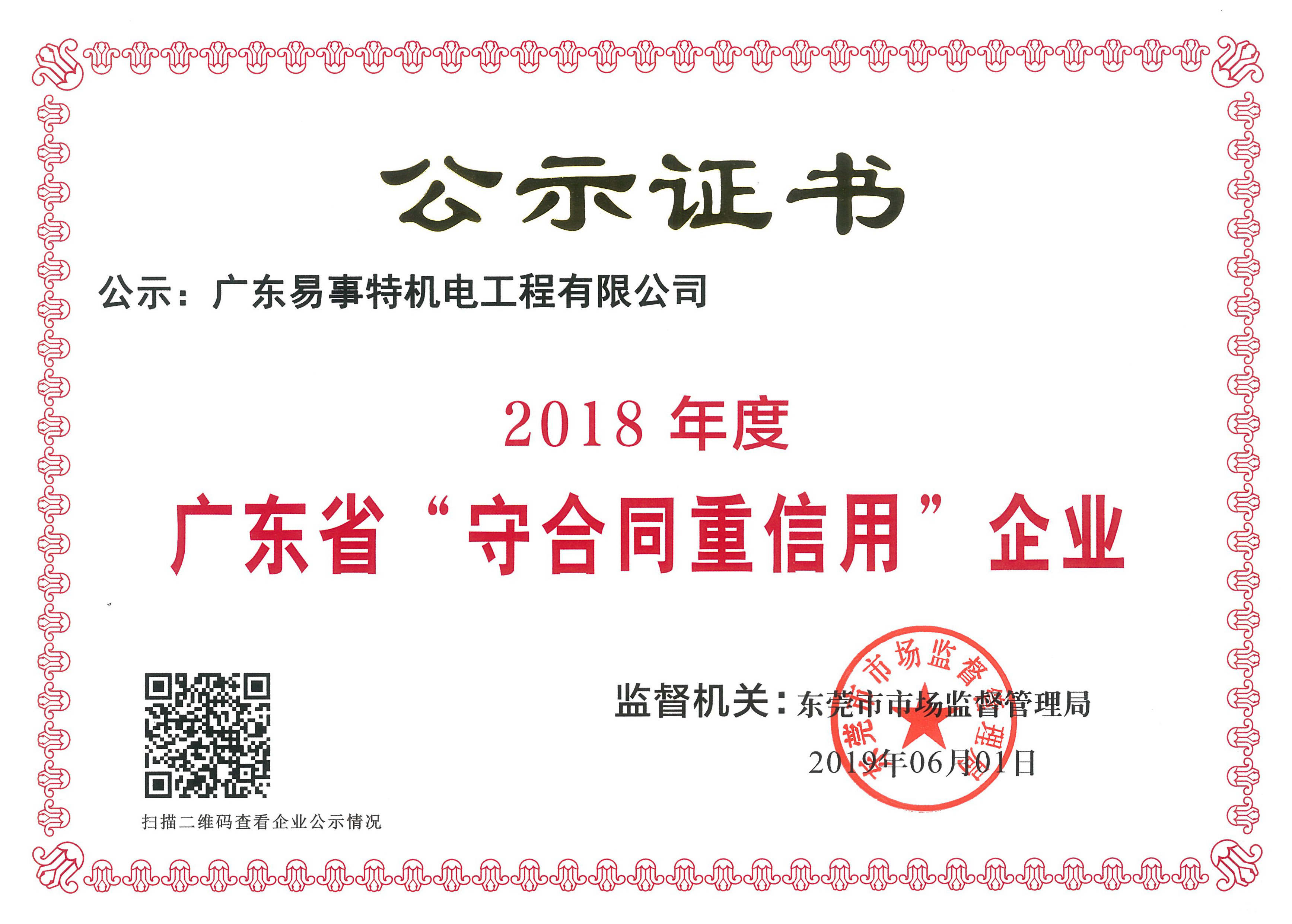 2019年6月1日,廣東易事特機電工程有限公司被東莞市市場監督管理局授予 “2018年度廣東省重合同守信用企業”榮譽稱號,預示著易事特機電在走向市場經濟規范化,提高企業守法經營能力,塑造企業良好信譽形象又邁上了一個新臺階。