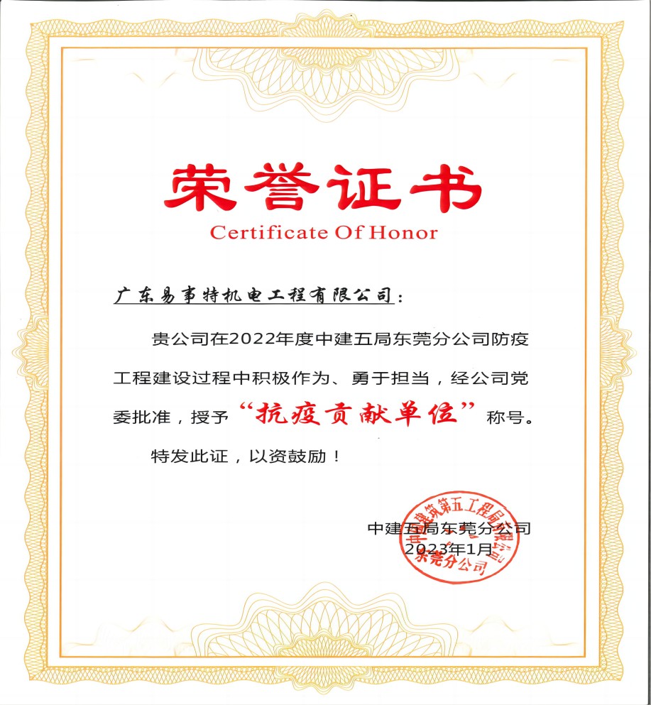 2022年,易事特機電憑借高質量高效率的抗疫工程項目,榮獲由中國建筑第五工程局有限公司授予的“